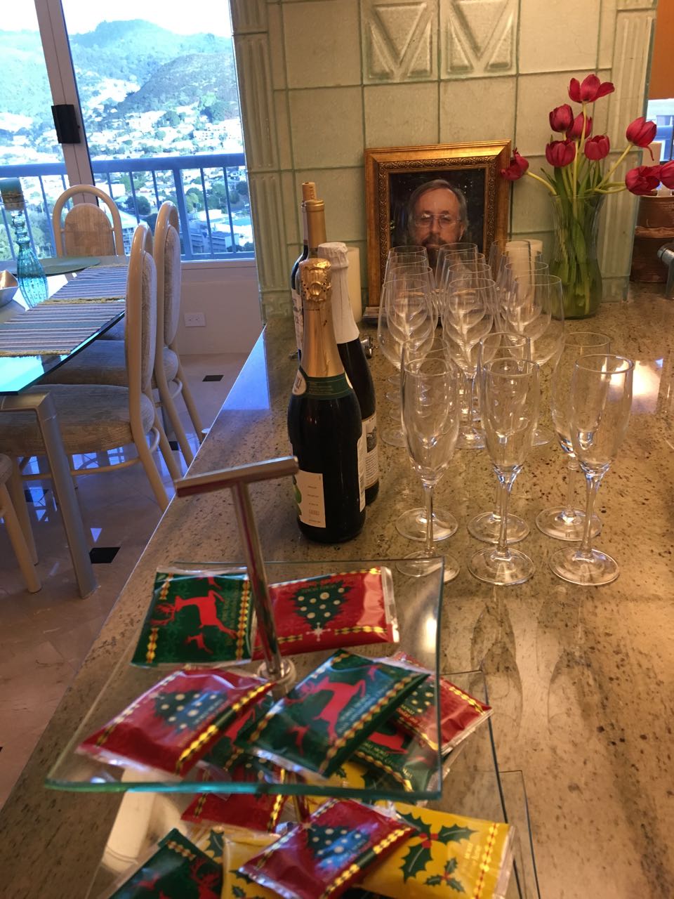 I had initially booked a reservation at our 8th floor party facility, the Koi Deck with its lovely waterfall and fish ponds, but because it has been so chilly at night (in the mid 60s!) I decided to move the party upstairs to my condo.